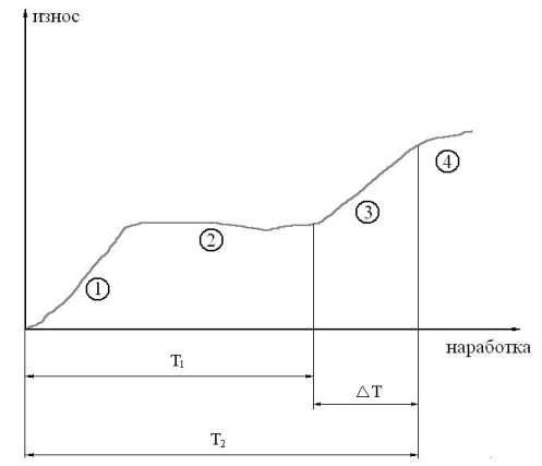 На этапе 1 имеет место довольно большой износ, связанный с приработкой, обычно на этом этапе оборудование эксплуатируется на пониженных режимах, 2-ой этап соответствует работе с безопасным износом, на 3-ем этапе происходит переход к критическому износу, который наступает на 4-ом этапе.