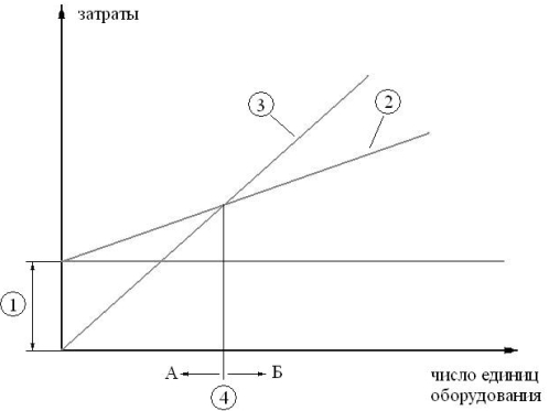 При работе по СППР затраты линейно нарастают в зависимости от числа единиц оборудования в парке (прямая 3), при использовании системы диагности необходимо понести первоначальные затраты на приобретение средств диагности и обучение персонала (прямая 1), после чего затраты ставятся пропорциональну числу единиц оборудования в парке (прямая 2).