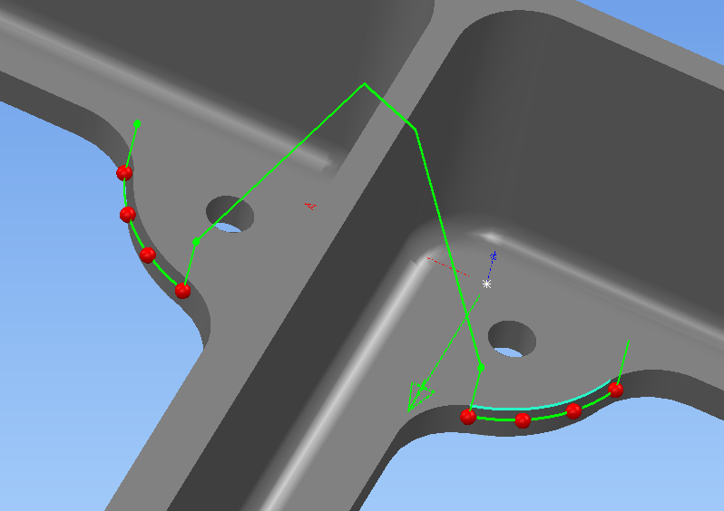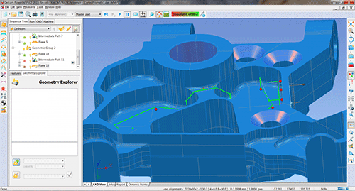 Реализованная в новой версии PowerINSPECT функция автоматического предотвращения столкновений самостоятельно добавляет (при необходимости) в прямолинейные участки траектории щупа маневры уклонения. В зависимости от конкретной ситуации измерительный щуп может быть либо приподнят над деталью, либо он может обогнуть препятствие в горизонтальной плоскости. Данная функция автоматически задействуется как при генерации траектории для новой последовательности замеров, так и при изменении порядка выполнения измерений, а также в случае добавления или удаления контрольных точек в ранее заданной последовательности. Естественно, что пользователь PowerINSPECT 2015 имеет возможность редактировать автоматически сгенерированные траектории по своему усмотрению. Это может потребоваться, например в том случае, если применяется нестандартное крепежное приспособление, для которого отсутствует его точная 3D-модель, в результате чего пользователь вынужден перестраховываться. Функция автоматического предотвращения столкновений не только повышает производительность труда пользователя, но и исключает непредвиденные столкновения на реальной КИМ, приводящие к дорогостоящим поломкам.