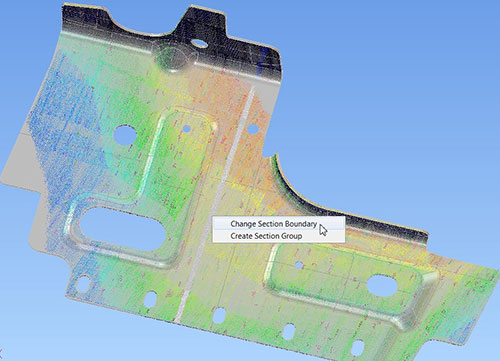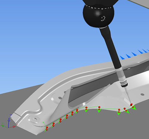 Возможности CAI-системы PowerINSPECT постоянно совершенствуются. Например, в 2013-й версии появилась поддержка двухстоечных КИМ с ЧПУ, применяемых в автомобильной промышленности на линиях кузовной сборки. В PowerINSPECT 2013 R2 был добавлен новый адаптивный метод контроля контура кромок листовых деталей на КИМ с ЧПУ, обеспечивающий улучшенный способ измерения тонкостенных пружинящих деталей, таких как штампованные металлические элементы кузова автомобиля, формованные изделия из композитных материалов и термоформованные пластиковые панели. Так как толщина измеряемой детали при этом соизмерима с диаметром сферы наконечника щупа, деформация детали может привести к тому, что КИМ с ЧПУ “промахнется” щупом мимо измеряемой кромки. Поэтому усовершенствованный метод предполагает последовательность контактных измерений в два касания. Первый замер выполняется на формообразующей поверхности детали вблизи измеряемой кромки и позволяет определить истинное положение формообразующей поверхности и прилежащей кромки детали. Второй замер делается непосредственно на кромке, после чего истинный размер кромки детали автоматически вычисляется на основе координат центра щупа и его диаметра.