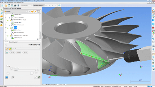 При создании последовательностей замеров для стационарных КИМ с ЧПУ и станков с ЧПУ, оснащенных прецизионными контактными измерительными системами, очень важно обеспечить надежность (безопасность) и эффективность управляющих программ, так как любые столкновения чреваты дорогостоящими поломками. Для трехмерной визуализации процесса выполнения замеров в PowerINSPECT используются точные 3D-модели КИМ, измерительного щупа, крепежной оснастки и CAD-модели изделия. В процессе компьютерной симуляции пользователь имеет возможность ускорять или замедлять процесс, чтобы досконально исследовать все участки управляющей программы на возможные столкновения. В том случае, если по какой-то причине пользователь изменил траекторию щупа на каком-либо участке управляющей программы, он может запустить выполнение 3D-симуляции на неизмененных участках в ускоренном режиме, а затем замедлить процесс для детального изучения отредактированной части траектории.