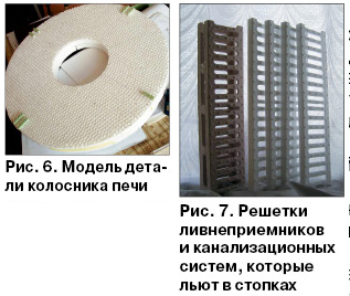 На рис. 7 слева показана решетчатая конструкция отливки, которую удобно собирать в пространственную решетку из моделей, 4 модели из пенополистирола показаны справа. Такую отливку из легированного чугуна получают в виде единой стопки решеток из десятка штук, стопка имеет высокую жесткость и дает при литье стабильные размеры отдельных плоских решеток, а также оптимально заполняет литейную форму по объему до максимального числа отливок в ней. Затем стопку разрезают на отдельные плоские решетки для ливнеприемников и канализационных систем.