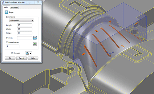 Функция «Тело-Пуансон» позволяет подобрать для группы выбранных поверхностей заготовку (в том числе стандартного размера) прямоугольной или цилиндрической формы. Пользователь может перетаскивать грани мышью для добавления материала с любой стороны.