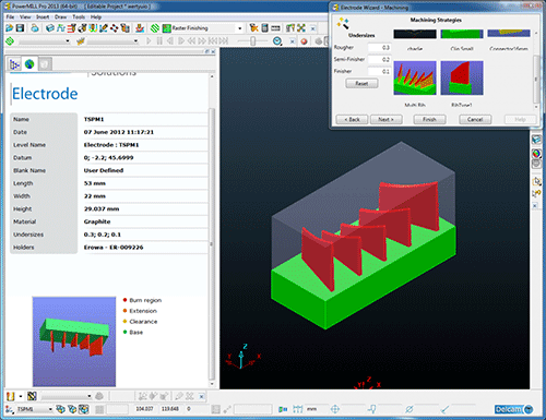 Модуль создания электрода PowerSHAPE, предназначенный для проектирования электродов, позволяет при помощи последовательных диалоговых окон задать все параметры электроэрозионной обработки и экспортировать управляющие программы для EDM-станка.