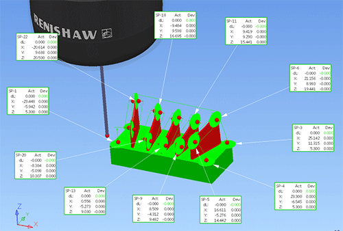 Для сравнения в CAI-системе PowerINSPECT результатов фактических замеров электрода сложной формы (изготовленного с учетом межэлектродных зазоров) с его теоретической CAD-моделью применяется функция оптимального совмещения. Наличие в файле проекта набора заданных контрольных точек позволяет упростить создание последовательности контактных измерений и автоматизировать анализ результатов. Если в процессе анализа измерений какие-то участки электрода вызвали подозрение, то PowerINSPECT позволяет легко выполнить дополнительные замеры.