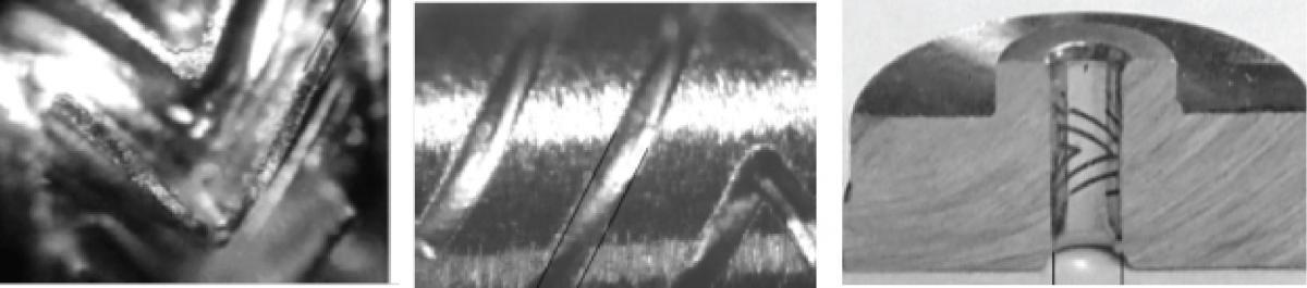 Так, в работе [2] описаны результаты экспериментов по изготовлению микроканавок шириной 200 мкм и глубиной 10 мкм на внутренней поверхности отверстия диаметром 1,5 мм. Материал изделия – коррозионно-стойкая сталь. Канавки елочного типа наносили после ввода специального инструмента в предварительно подготовленное отверстие (рис. 2). Цилиндрической частью инструмента осуществляли отделочную обработку отверстия до требуемой шероховатости, а профилированной частью изготовляли елочные канавки. Обработку производили в нестационарном режиме формообразования импульсным током при следующих параметрах режима электролиза: