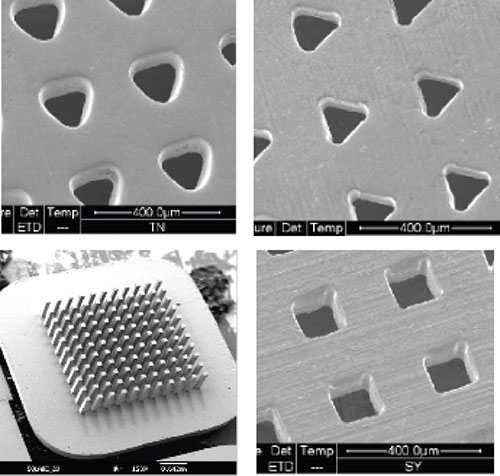 В качестве электролита использовали водный раствор хлората натрия. Показано, что размеры и конусность отверстия, прошитого инструментом с изоляцией боковой стенки значительно меньше, чем в случае применения неизолированного инструмента. На рис. 3а, 3б показаны отверстия треугольного сечения, прошитые с применением указанных инструментов, а на рис. 3в, 3г – инструмент для одновременной прошивки 121 отверстия квадратного сечения в никелевой фольге толщиной 100 мкм и прошитые отверстия.