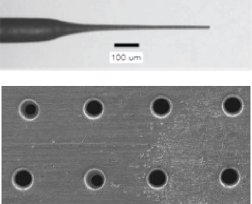 В работе [5] предложена технология изготовления такого инструмента путем электрохимического растворения исходной заготовки. На рис. 4а показан инструмент диаметром 11 мкм и длиной 600 мкм из никеля, полученный анодным растворением электрода в предварительно изготовленной матрице. Таким электродом прошили отверстия диаметром 60 мкм и длиной 100 мкм в никелевой фольге (рис. 4б).