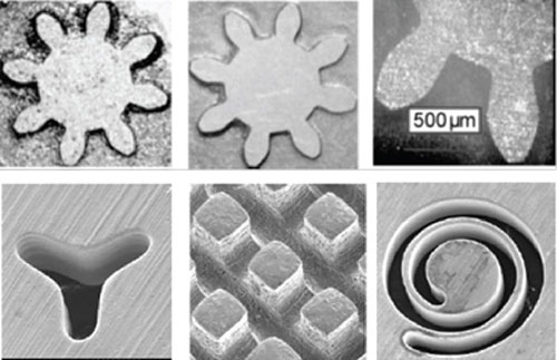 При величине МЭЗ около 10 мкм влияние добавок и скорости вращения электрода исследовалось экспериментально при получении отверстий диаметром 30 мкм. Выполняли ЭХФ на станке с ЧПУ вращающимся цилиндрическим электродом с целью получения объемных микроструктур [7]. Примеры различных объемных структур, полученных элект-рохимической микрофрезерованием показаны на рис. 5.