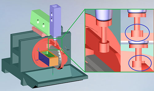 Реалистичное моделирование обработки — фотореалистичное отображение обработки детали в трехмерной модели оборудования (рис. 1–5) и отслеживание соударений (рис. 6) — показатель надежности создания управляющей программы и долговечности оборудования.