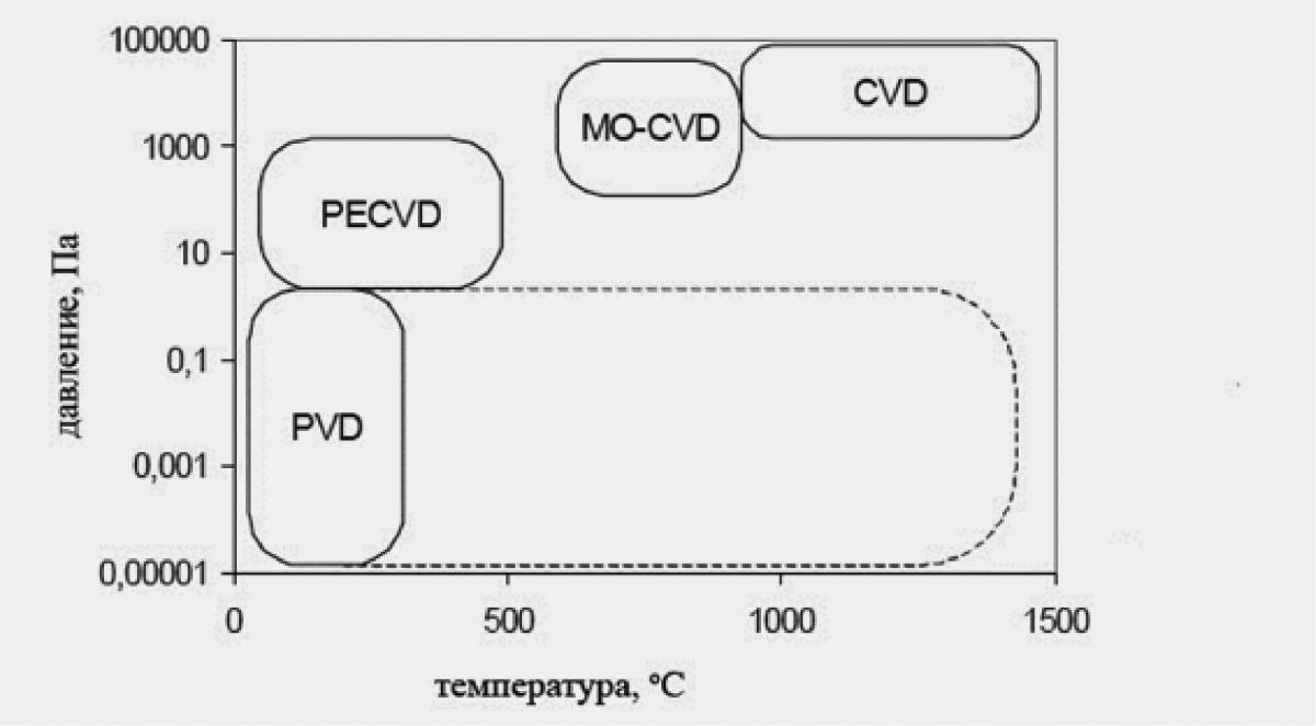 Рис. 1. Виды процессов осаждения покрытий в зависимости от параметров давления и температуры их проведения, где CVD — химическое осаждение покрытий, PVD — физическое осаждение покрытий, PECVD — химическое осаждение покрытий с плазменной активаций, МО-CVD — химическое осаждение покрытий с использованием элементоорганических соединений.