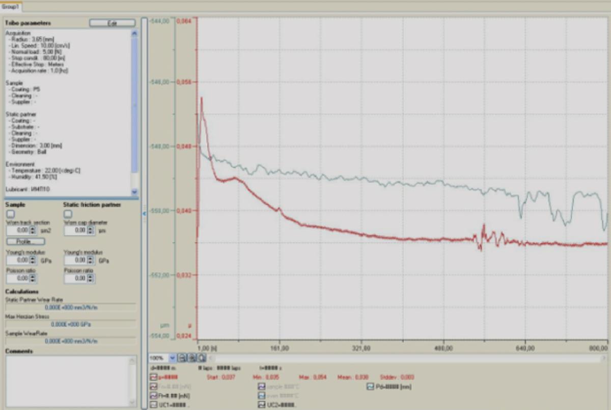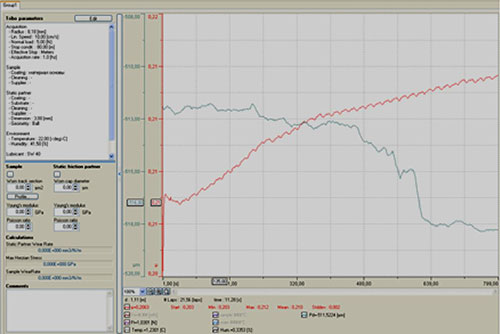 протокол испытаний покрытия Si-O-C-N с графиками изменения со временем коэффициента трения и глубины заглубления индентора в материал покрытия, а также вид полосы износа с замерами ее ширины на образце с покрытием.