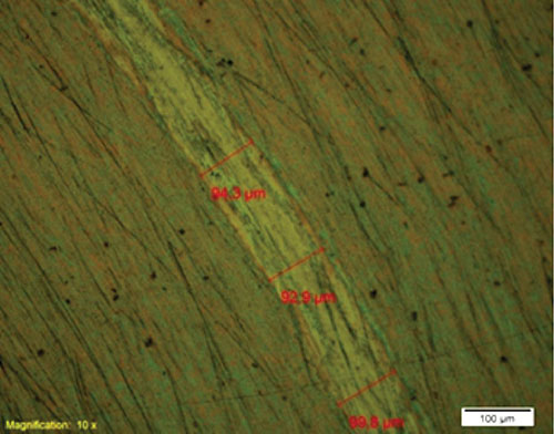 При каждом испытании использовался новый шарик, а его износ при оценке диаметра образующейся лунки не превышал 0,1–0,2 мкм. Нагрузка на контртело составляла 5Н. Линейная скорость — 10 см/с. Путь трения — 80 м. При испытаниях использовалась смазка SAE5 W40. Ширина следа износа после трибоиспытаний определялась с использованием микроскопа Olympus GX 51.