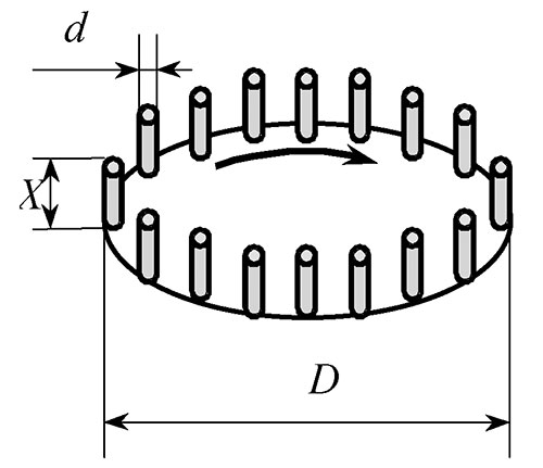 Нанесение покрытия системы Si-O-C-N на сверла диаметром менее 10 мм возможно при их групповой обработке с расположением упрочняемых изделий по окружности в специализированной оснастке на диаметре планшайбы D (рис. 5). Поворот изделий вокруг собственной оси может быть периодический с учетом необходимого обеспечения воздействия плазмы на все стороны упрочняемых поверхностей (например, с шагом на 180 градусов при диаметре изделий менее 6 мм) или с постоянным вращением вокруг собственной оси, но с учетом того, чтобы относительное перемещение обрабатываемой поверхнос-ти и плазменной струи не превышало 150 мм/с, что обусловлено газодинамическими процессами взаимодействия обрабатываемой поверхности и плазменной струи.