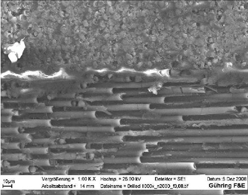 Рис. 2. Сечение отверстия, увеличенное под микроскопом (углепластик с однонаправленными волокнами).