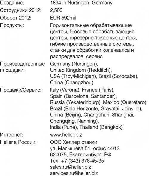 Более 100 лет наша компания фокусировалась на потребностях рынка и клиентов. Именно это помогло нам стать успешными. Для оптимизации наших преимуществ, мы координируем инжиниринг, продажи и сервис в различных странах. Наши производственные площади в Европе, Северной и Южной Америке и в Азии гарантируют надежные поставки нашим заказчикам. Развитие глобальной производственной сети предоставило HELLER Group стратегическое преимущество. Производственные площадки приближены к рынкам, использующим технологии, которые проектируются для конкретных задач, а многофункциональное производственное оборудование гарантирует высокую гибкость и оптимизацию стоимости.