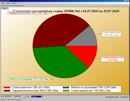 Каждое состояния станка имеет свой цвет и приоритет отображения на диаграммах и в таблицах. Диаграмма контроля станков в реальном времени представлена на рис. 3, отчет по работе станка в виде круговой диаграммы – на рис. 9.