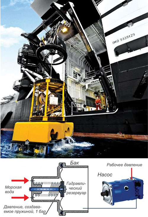 Известно, что 2/3 земной поверхности покрыты водой, и многие потенциальные ресурсы этой зоны еще ждут разведки и разработки. В подводных автономных транспортных средствах (рис. 15) широко используется гидравлика, отличающаяся, прежде всего, высокими плотностью энергии и надежностью. Здесь особенно ярко проявляются также и другие преимущества гидроприводов: мощность, компактность, точность, интеллект и возможность резервирования функций. Сложные электрогидравлические системы позволяют дистанционно контролировать, например, устья нефтяных скважин или кабели связи. Учитывая, что при погружении на каждые 10 м давление возрастает на 1 бар, на глубинах более 300 м гидростатическое давление становится серьезной проблемой. Показанная на схеме система компенсации наружного давления воды обеспечивает разделение сред с помощью специальной мембраны. При создании оборудования большое внимание должно уделяться также вопросам экологии и коррозионной стойкости в соленой морской воде. В частности для защиты штоков гидроцилиндров применяется газотермическое напыление. Специальное покрытие Ultraplate фирмы Hunger Hydraulik основано на методе сварки дуговой плазмой.