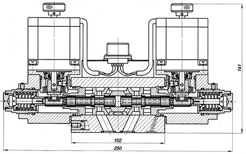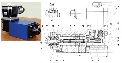 ШД 6 расположен в передней крышке 4 перпендикулярно к оси золотника 3 и имеет на своем валу манжету 12 и эксцентрик 13, который через шарикоподшипник 14 взаимодействует с торцовыми поверхностями поперечного паза, выполненного на золотнике, а угол поворота эксцентрика ограничен фиксатором 16. Для повышения жесткости эксцентрика он центрируется подшипником 18 относительно фланца 15. На рисунке также обозначены: 17 — винт регулирования нулевого положения; 19 — шпонка; 20 — компенсатор; 21 — пробка; 22 — стопор; 23 — маховичок; 24 — фиксатор; 25 — пробка сливной линии. В аварийной ситуации (или при штатной остановке гидропривода) отключается ШД, развиваемый им крутящий момент падает, и пружина 7 устанавливает золотник 3 в нейтральную (безопасную) позицию. Гидрораспределитель имеет монтажные размеры Dу=10 мм по ISO 4401 и массу 4,5 кг. Успешно завершены испытания опытного образца в составе линейного электрогидравлического привода Л-100.