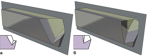 Рис. 2. Инструмент с передним углом ? = 56°; а – угол наклона главной режущей кромки ? = 0°; б –? = 46° (инструмент для ДР)