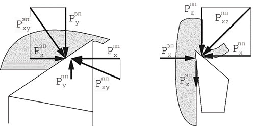 Рис. 6. Схема действия сил на рабочие поверхности инструмента для ДР. Обозначение индексов: ЗП – силы, действующие на главную заднюю поверхность, ПП – то же для передней поверхности.