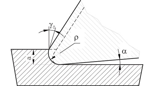 При обработке пластичных материалов с малыми подачами, составляющими десятки микрометров, существенное влияние на процесс резания начинает оказывать радиус округления главной режущей кромки ?, поскольку он становится соизмерим с толщиной срезаемого слоя.