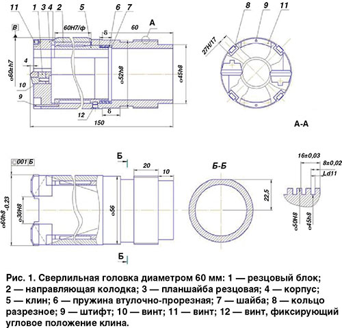 Сверлильная головка (рис. 1) диаметром 60 мм состоит из корпуса 4, резцовой планшайбы 3, соединяемой с корпусом винтами 11 и фиксируемой штифтами 9. В планшайбе винтами 10 крепятся два резцовых бока 1. Внутри корпуса расположены клин 5, втулочно-прорезная пружина 6 и компенсирующие шайбы 7. С помощью сменных шайб производится регулирование усилия натяга на направляющих колодках 2, а также компенсация износа направляющих колодок по диаметру в процессе эксплуатации. Колодки охвачены разрезным кольцом 8.