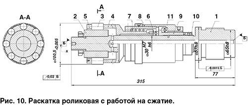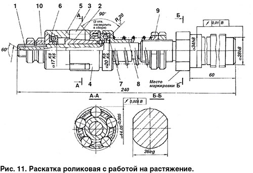 Раскатка для работы на растяжение (рис. 11) выполнена жесткой и регулируемой. Она состоит из оправки 1, на которую напрессована коническая втулка 2. По этой втулке вращаются ролики 3, установленные в сепараторе 4 и закрытые крышкой 5. Сепаратор и крышка опираются на упорные подшипники 6 и 7. Пружина 8 взводит ролики в рабочее положение. Усилие пружины регулируется гайками 9. С помощью гаек 10 осуществляется регулирование диаметра раскатки по роликам. На правом конце раскатки расположены две точные цилиндрические шейки и двухзаходная прямоугольная резьба для соединения раскатки со стеблем. Раскатка работает по методу на растяжение. Порядок выполнения операции раскатывания: