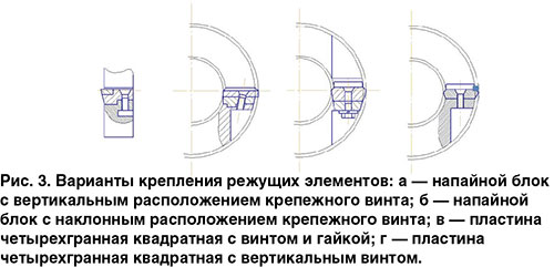 В конструкциях предложен ряд вариантов установки и крепления, как напайных блоков, так и четырехгранных квадратных сменных пластин (рис. 3).