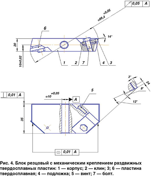 Возможно использование и блока с напайными пластинами твердого сплава (рис. 5). Такой блок более жесткий и более прост в заточке.