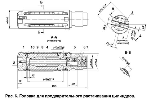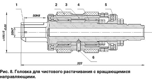 Головка (рис. 8) выполнена с вращающимися направляющими для снижения их износа. При этом уменьшается величина перемещения направляющих при обработке до длины отверстия заготовки вместо (lзаг/S0) при невращающихся направляющих. Где d — диаметр отверстия заготовки; lзаг — длина отверстия заготовки; S0 — величина подачи инструмента на оборот заготовки. Головка работает на сжатие.