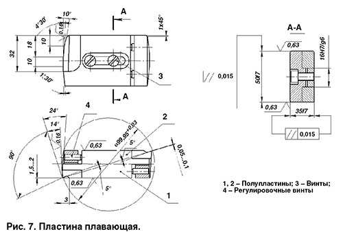 Пластина плавающая (рис. 7) выполнена в виде двух полупластин 1 и 2, скрепленных винтами 3. Регулирование (раздвижение) пластин осуществляется винтами 4 при ослабленных (отвернутых) винтах 3. После регулирования полупластины фиксируются снова винтами. На каждой полупластине припаяна пластина твердого сплава марки T15K6. Припой — латунь Л63.