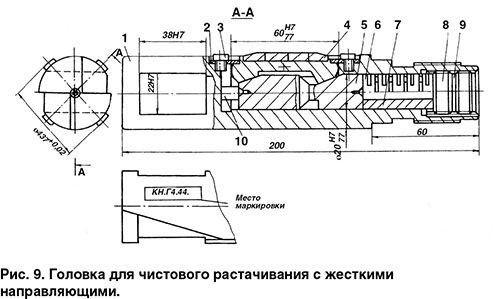 Головка расточная с жесткими не вращающимися направляющими (рис. 9) целесообразна к использованию при обработке отверстий диаметром менее 80 мм. Головка состоит из корпуса 1, направляющих 4 с твердосплавными пластинами марки ВК8, опирающихся на клин 5, пружины 6, регулировочных винтов 8 и стопорной шайбы 9. От выпадания направляющие удерживаются планками 2 и винтами 3. При шлифовании направляющих в сборе в передней части устанавливается жесткий упор 10, а вместо пружины мерная втулка 7. После шлифования упор вынимается из головки, а пружина ставится на место втулки.