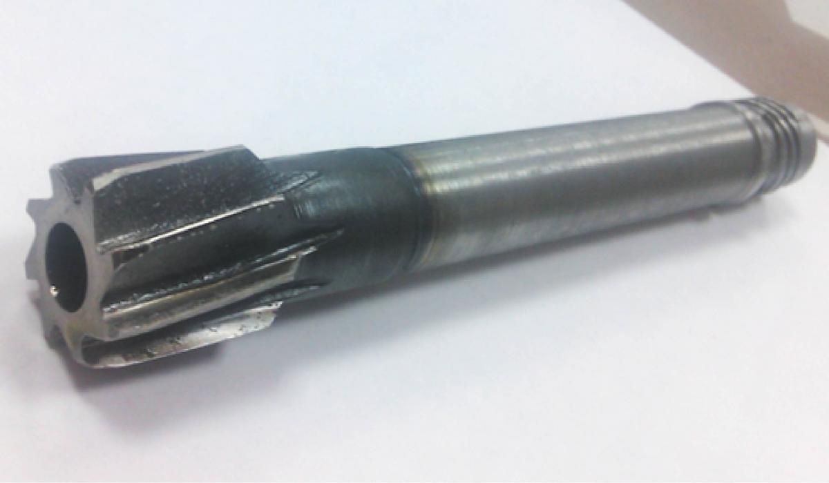 Практика показывает, что применяемые ранее на производстве головки для глубокого сверления, ввиду специфичности обрабатываемого материала — конструкционной высоколегированной стали 34ХН1 М, имели низкую стойкость как режущих, так и направляющих пластин. Для решения представленной проблемы при чистовой обработке глубоких отверстий предложено использование разверток из быстрорежущей стали, с доработкой для использования на станке для глубокого сверления и упрочненных твердым сплавом. Развертка улучшает шероховатость и точность отверстия после предшествующей обработки. В описанном случае была применена нормализованная развертка (рис. 1) со следующими характеристиками: количество зубьев — 8; наклон зубьев — левый; материал рабочей части — быстрорежущая сталь Р6 М5. Однако, большой путь резания, приходящийся на режущую кромку при обработке глубоких отверстий, обусловливает интенсивное изнашивание инструмента при обработке партии деталей. Поэтому при обработке глубоких отверстий необходимо применение мер по повышению работоспособности разверток.
