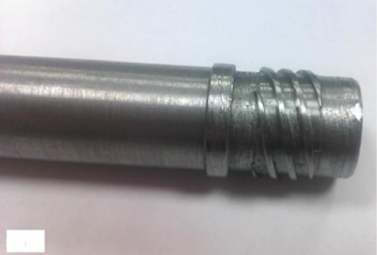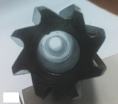 С целью повышения износостойкости развертки и гарантированного выполнения технических условий на изготовление деталей с глубиной обработки отверстия более 900 мм на режущие зубья инструмента нанесен твердый сплав марки Т15 К6. Упрочнение осуществлялась на установке ЭИУ-1 на следующих режимах: рабочее напряжение — 20 В, сила тока — 1 А. Толщина нанесенного слоя составила 0,005 мм. Твердый сплав наносился через один зуб развертки, т. е. было получено 4 упрочненных зуба и 4 необработанных. Данное решение обусловлено тем, что лезвия твердосплавного инструмента имеют менее острую геометрию заточки, чем инструмент из быстрорежущей стали. Поэтому, после прохода упрочненного зуба материал обработанной поверхности упруго восстанавливается на величину, удаляемую вступающим следом в работу неупрочненным зубом из быстрорежущей стали.