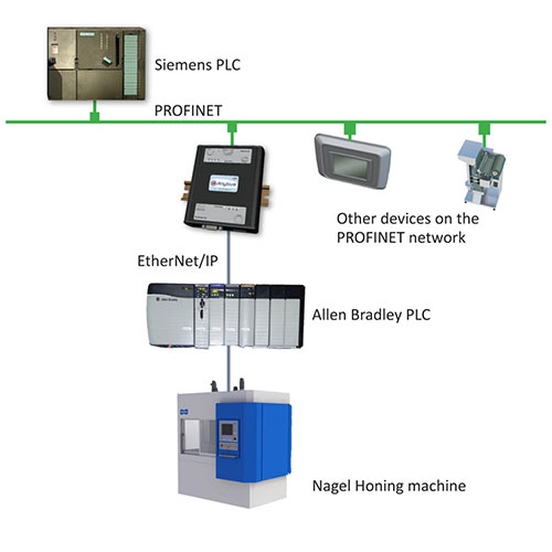 Система управления станков производства компании Nagel Precision рассчитана на работу в сети EtherNet/IP с ПЛК Allen Bradley, часто с многоосевыми сервоприводами Rockwell Kinetix 6000 в качестве центрального устройства. Однако, с того момента, как шлифовально-полировальные станки стали экспортироваться на заводы всего мира, компания Nagel столкнулась с проблемой обмена информацией в других сетях, в частности, с сетевым протоколом PROFINET, который часто используется на заводах по производству автомобилей.