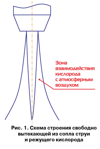 газы подогревающего пламени, находящиеся в разрезе позади струи режущего кислорода, оказывают на нее давление, обусловленное процессом горения, что обеспечивает прохождение струи кислорода, как в трубе, защищая от взаимодействия с продуктами горения и атмосферным воздухом до места затухания пламени;