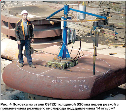 В заключение настоящей статьи необходимо отметить, что, несмотря на выявленные преимущества технологии кислородной резки сталей большой толщины кислородом низкого давления, технология резки высоким давлением (1225 кгс/см2) может применяться для толщин до 600800 мм. Но при выборе технологии надо четко определить приоритеты, дать точную оценку технологическим возможностям имеющегося оборудования, а также технической и энергетической вооруженности участка резки. Резка м/у стали толщиной 900 мм с применением технологии низкого давления (3 кгс/см2) режущего кислорода приведена на рис. 2 и 3. Резка стали 09Г2С толщиной 630 мм с применением технологии высокого давления (14 кгс/см2) приведена на рис. 4, 5 и 6.