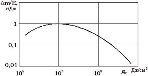 Из рисунка видно, что эти зависимости близки к линейным для всех рассмотренных материалов, что свидетельствует о неизменном соотношении между жидкой (кластерной) и парообразной фазой. Для стеклоуглерода характер разрушения несколько изменяется, стабилизируясь при плотности энергии в тысячу раз превышающей порог абляции, порядка 10000 – 12000 Дж/см2.