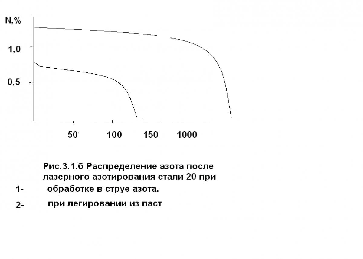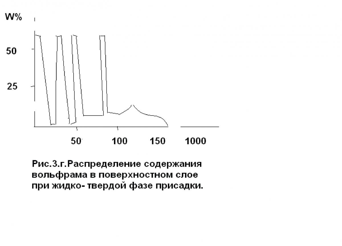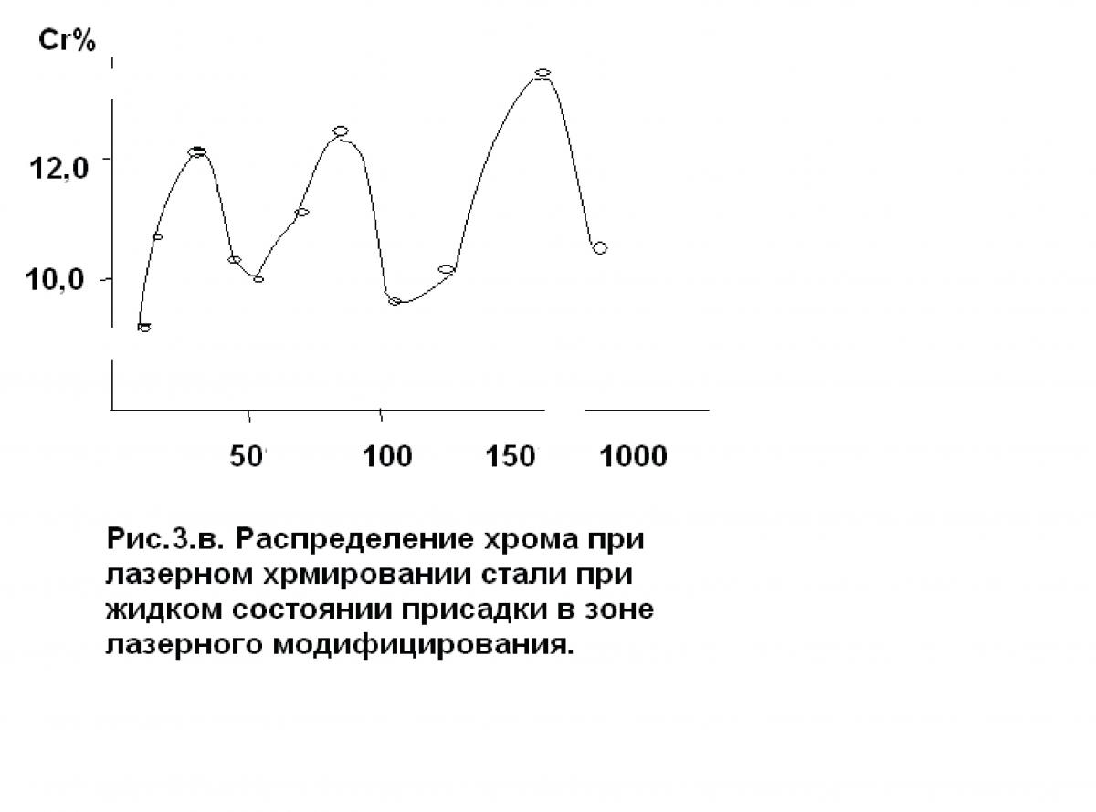 В зависимости от взаимной растворимости, наличия химического взаимодействия, образования новых фаз, наблюдается вид рис. 3в распределения химических элементов присадочного материала в поверхностном слое. Отмечается часто переменный состав легирующих элементов из-за высокой скорости процесса лазерного легирования и высокой скорости конвективного перемешивания. Причем под слоем жидкого расплава наблюдается также обогащение твердой фазы основы, прилегающей к расплаву.