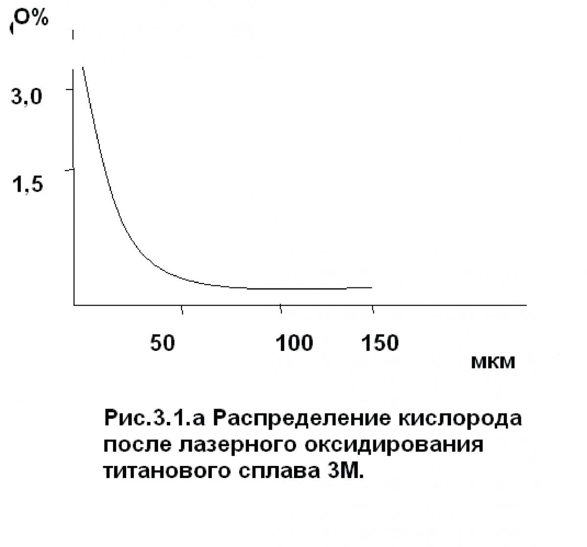 При отсутствии оплавления исследования, проведенные рентгеноспектральным методом, показали, что в результате лазерного легирования поверхностный слой обогащен легирующими элементами. Характер их распределения, прежде всего, зависит от агрегатного состояния присадки. Характерное распределение, подобное распределению кислорода в сплаве 3 М, (рис. 3а) имеет монотонно убывающий вид. Более подробно об этой технологи было изложено в [1].