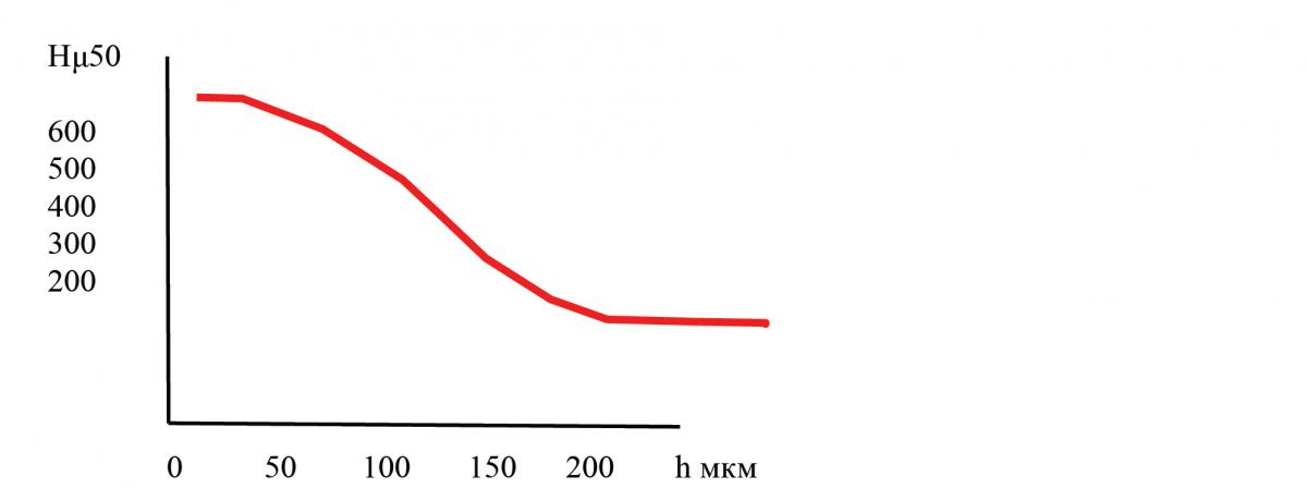Рис. 4. Распределение микротвердости после лазерного легирования в азоте стали 08Х18 Н10 Т.