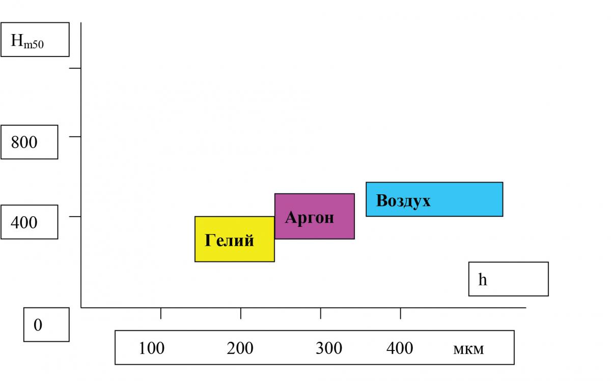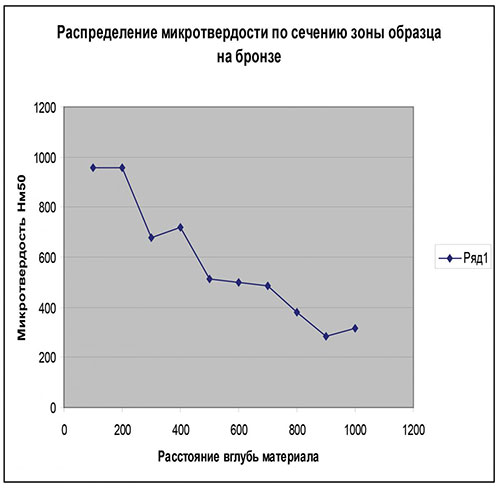 Рис. 7. Замеры глубины и твердости поверхностного модифицированного слоя на бронзе БрАЖНМц 9-4-4-1 при одних и тех же параметрах обработки: плотность мощности 2х104 Вт/см2, скорость 30 мм/с, диаметр луча 1,5 мм в различных средах обработки.
