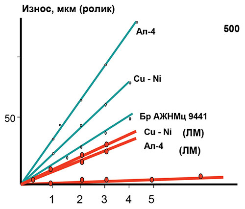 Исследования износостойкости выполнялись на машине Шкода-Савина при трении ролика по исследуемым материалам при наличии смазки при нагрузке 200 Н и скорости вращения ролика 700 об/мин.