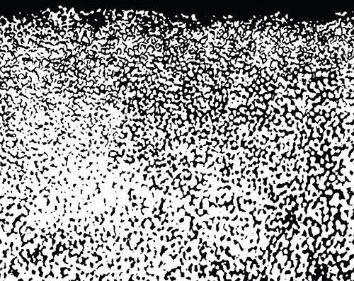 Из приведенных данных видно, что при одинаковых параметрах обработки дисперсность структуры бронзы БрАЖНМц9-4-4-1 выше, чем стали 40Х, что объясняется более высокой теплопроводностью бронзы и, следовательно, более высокими скоростями охлаждения. На рис. 4 представлены фотографии микроструктур зоны оплавления бронзы БрАЖНМц9-4-4-1 при скоростях обработки 0,02, 1,0 и 2 м/с. При скорости обработки 0,02 м/с наблюдается ориентированная вдоль направления теплоотвода структура с размерами зерен 1–5 мкм. При скорости обработки 2 м/с структура зоны оплавления не выявляется в оптическом микроскопе при увеличении до 1000х, т. е. размер зерна становится меньше 0,1 мкм. Фазовый рентгеноструктурный показал (рис. 3), что при увеличении скорости обработки происходит размытие рефлексов от кристаллографических плоскостей, и при скорости 2 м/с наблюдается гало, т. е. материал становится рентгеновски аморфным. Следует отметить, что толщина не травящегося (КНК) слоя при мощности излучения 2,5 кВт составляет для бронзы БрАЖНМц9-4-4 120–25 мкм. Микроструктура этого слоя представлена на рис. 5.