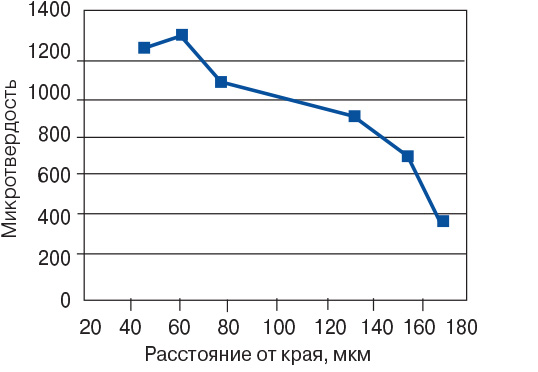 Рис. 11. Распределение микротвердости по сечению упрочненной зоны при упрочнении под углом 40°, при мощности излучения 2 кВт, скорости обработки 250 мм/с.