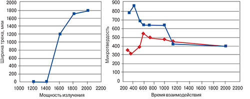 На рис. 3 представлена зависимость ширины трека от мощности излучения, из которой видно, что ширина зоны термоупрочнения (в дальнейшем ширина трека) зависит от мощности излучения. Чем больше мощность излучения, тем шире зона обработки.
