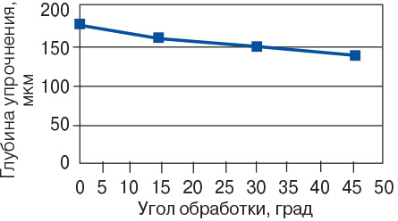 Рис. 8. Зависимость глубины упрочнения от угла обработки для стали 32 Г без чернения.