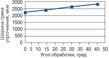Как видно из приведенных графиков, глубина упрочнения вплоть до угла 45° уменьшает глубину упрочнения примерно на 25–30%, а ширина упрочненного трека увеличивается на 15–25%. Зона упрочнения под углом приведена на рис. 10.