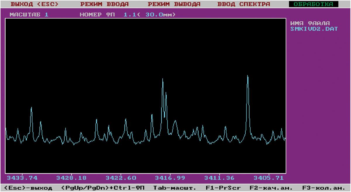 Для исследования применялась установка LDMA производства НПФ «Прибор-Т» СГТУ. Источник возбуждения спектров Nd: YAG-лазер (? = 1,06 мкм), работающий в режиме гигантского импульса с модулированной добротностью со следующими параметрами: частота следования импульсов 25 Гц, длительность импульса 5–9 нс, плотность мощности 1010–1012 Вт/см2, абсолютный предел обнаружения 10–10 г; относительный — 0,001%. В установке используется дифракционный спектрограф типа ДФС-458 с решетками 900, 1200 и 1800 мм-1 на три спектральных диапазона и ПЗС — камера высокого разрешения, обеспечивающая анализ в спектральном диапазоне 200–800 нм. Программное обеспечение разработано таким образом, что каждый спектральный диапазон отображается на 8 экранах. Пример скриншота экрана представлен на рис. 1. В экспериментах рассматривался традиционный спектральный диапазон 200–350 нм, поскольку в нем основные вещества имеют наиболее ярко выраженные спектральные линии.